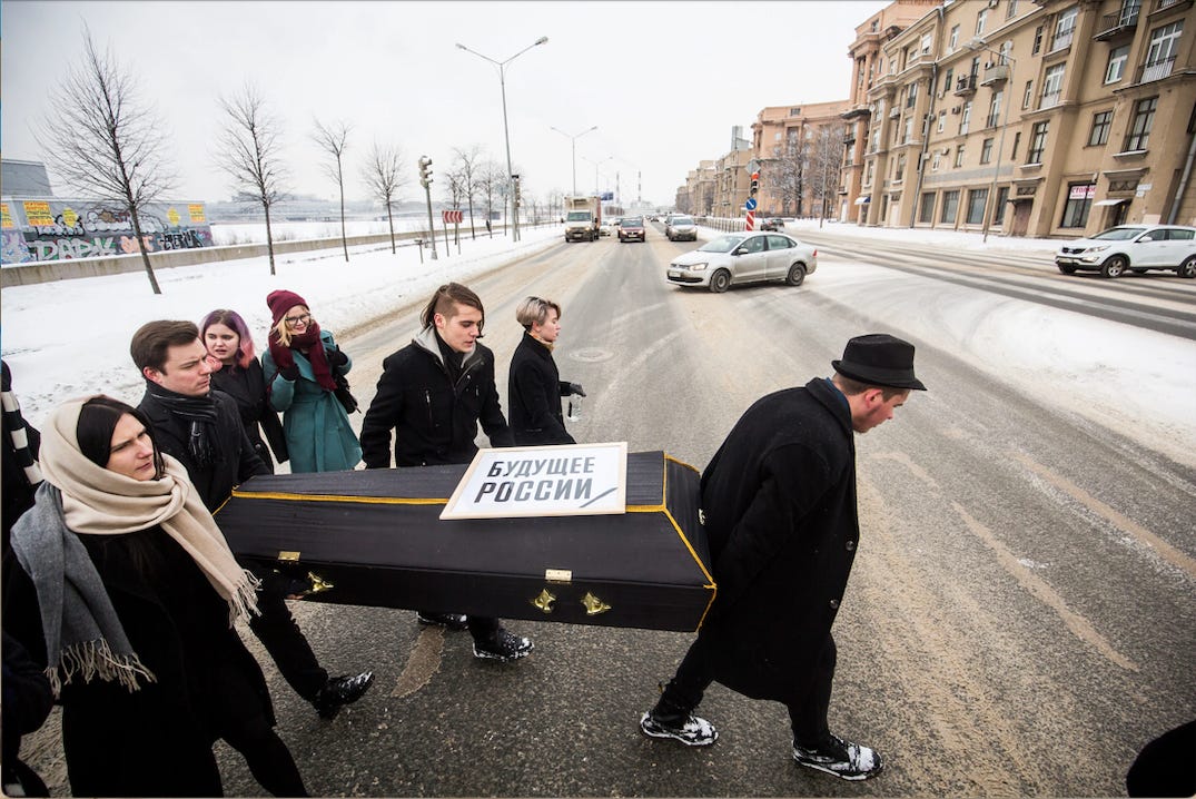 2018 год: молодые люди в черном со скорбными лицами носят черный гроб по улицам Петербурга, на котором лежит табличка «Будущее России». (Акция 2018 года, учитывая нынешние потери России в войне против Украины, оказалась воистину пророческой.)