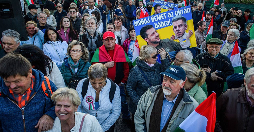 Как говорится, что? да! Украина и ее президент стали главными героями венгерской избирательной кампании. Действующий премьер Виктор Орбан, ныне борющийся за сохранение власти после 16 лет правления, сделал ставку в избирательной кампании на внешнюю политику, а в ней — на демонизацию Украины. Постеры и билборды с изображением Зеленского и надписями «опасность» или «это риск» можно увидеть в центре Будапешта и на обочинах провинциальных автодорог; Украина не сходит с первых полос газет и постоянно фигурирует в новостных сюжетах государственного телевидения. В марте в центре Будапешта прошел многотысячный марш, участники которого вполне серьезно собрались под лозунгом «Не допустим, чтобы Венгрия стала колонией Украины» (что? да…)